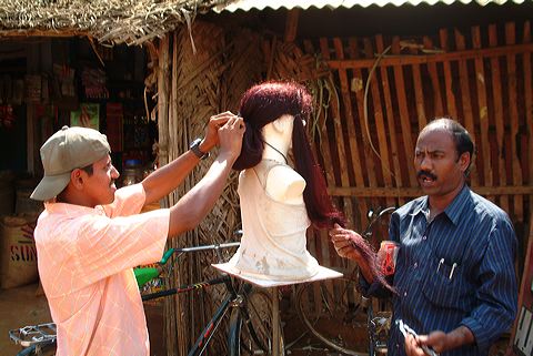 Una dimostrazione per le strade del villaggio per mostrare nuovi metodi di acconciatura femminile