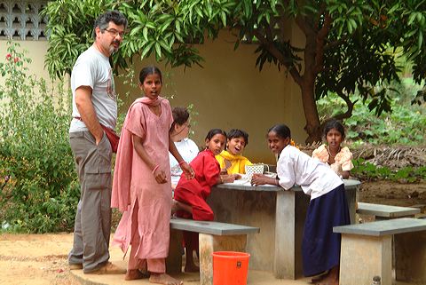 Dei volontari che giocano con le bambine di ABChildren Orphanage di Koovathur